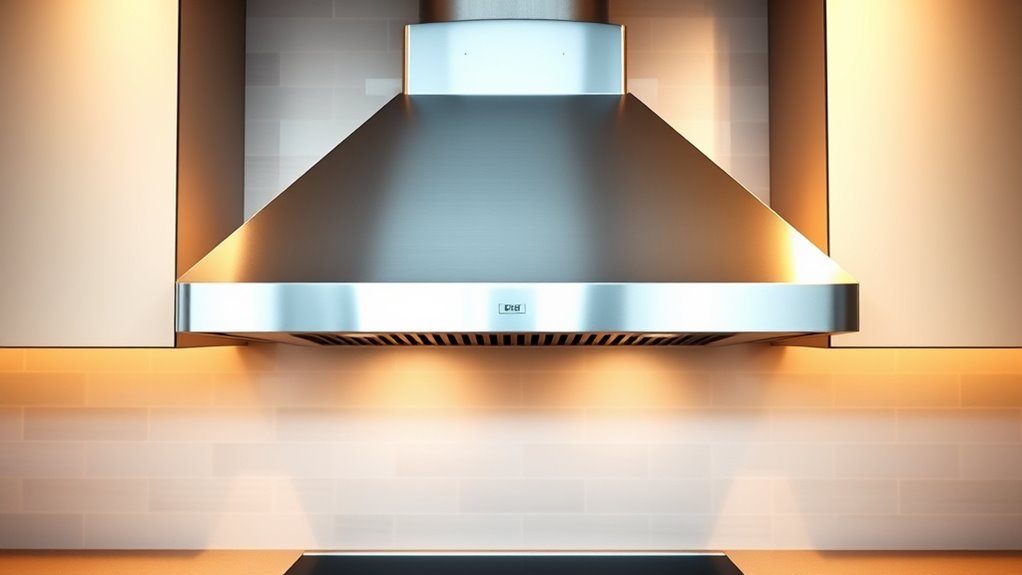 You’re wondering if eco-friendly or energy-saving range hoods exist. Yes, there are energy-efficient options with eco-friendly designs that reduce power consumption and minimize environmental impact. Look for models with Energy Star certification, which guarantees they meet strict efficiency standards. These hoods often feature better airflow, quieter operation, and advanced technology, helping you save energy while keeping your kitchen well-ventilated. Switching to these options benefits both your wallet and the planet.
