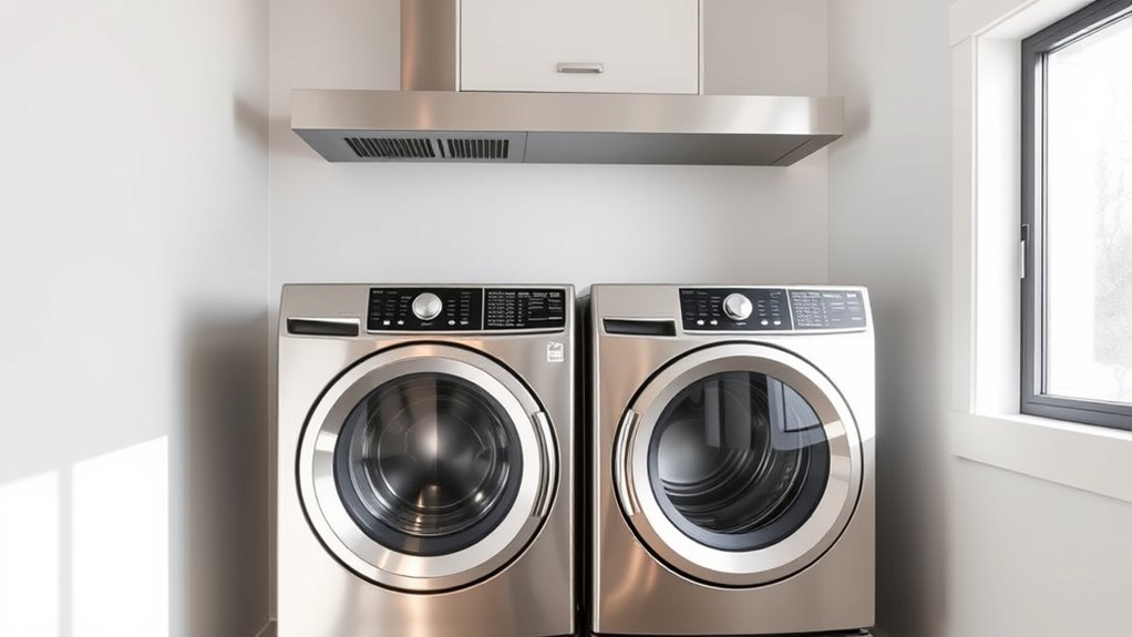 To optimize your laundry room, select washers with capacities of 3.0 to 5.0 cu ft, balancing space and load size, while matching your dryer’s capacity to prevent bottlenecks. Make certain proper venting—using rigid metal ducts for vented dryers and short, straight pathways—to avoid lint buildup and fire hazards. Place appliances on level surfaces near dedicated electrical outlets and accessible plumbing, allowing for safe operation and maintenance. Mastering these details will help prevent issues and improve efficiency throughout your laundry routine.