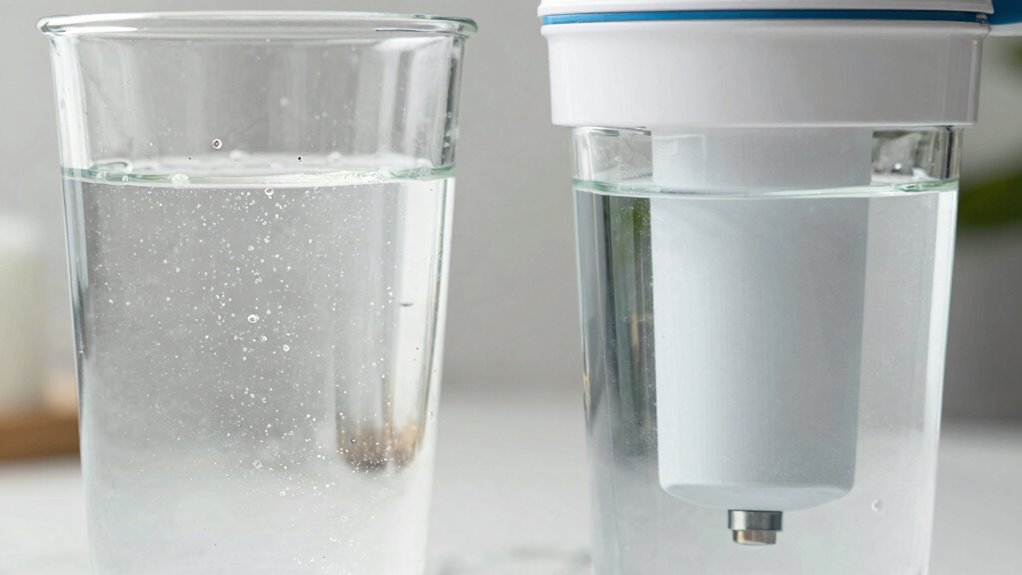 You’ll notice that water filtration involves filtering methods to remove contaminants like bacteria, chemicals, and sediments, improving taste and safety. Softening processes, on the other hand, focus on reducing hardness caused by minerals like calcium and magnesium, preventing scale buildup. While filtration targets impurities, softening specifically addresses mineral content. Both improve water quality, but they serve different purposes—so choose based on your specific needs.
