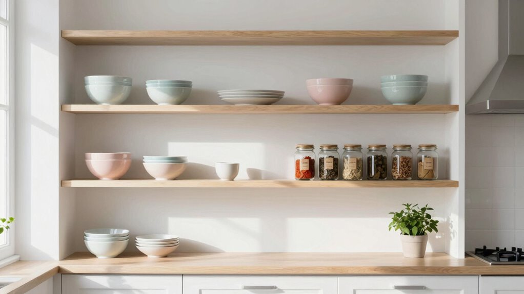 To keep your open shelves feeling calm and inviting, think of them as a gentle conversation rather than a busy marketplace. By thoughtfully selecting and arranging your items, you create a serene space that invites relaxation. Regularly tidying up keeps the peaceful vibe intact, preventing clutter from sneaking back in. With a little mindful effort, your shelves can effortlessly become a soothing focal point—an understated beauty that quietly enhances your space without shouting for attention.