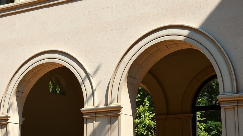 You should choose materials like reinforced concrete, steel, or stone for durable arches. Reinforced concrete offers strength and flexibility, making it ideal for complex shapes. Steel provides high tensile strength, ensuring longevity and resistance to stress. Stone, especially limestone or sandstone, offers natural durability and aesthetic appeal. Combining these materials can optimize structural integrity and longevity, enabling innovative designs while maintaining resilience in various environmental conditions.