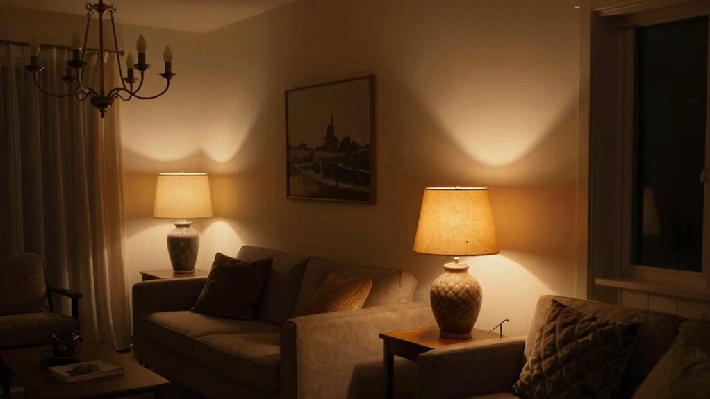If you want your room to radiate warmth, strategically place your lamps to create ambient shadows that cozy up corners and focal highlights that draw the eye. Avoid clustering lamps in one spot, or you’ll end up with a “flashlight effect” instead of a warm glow. Distribute light sources evenly across the room, and watch how ambient shadows and focal highlights work together to make your space inviting and toasty.