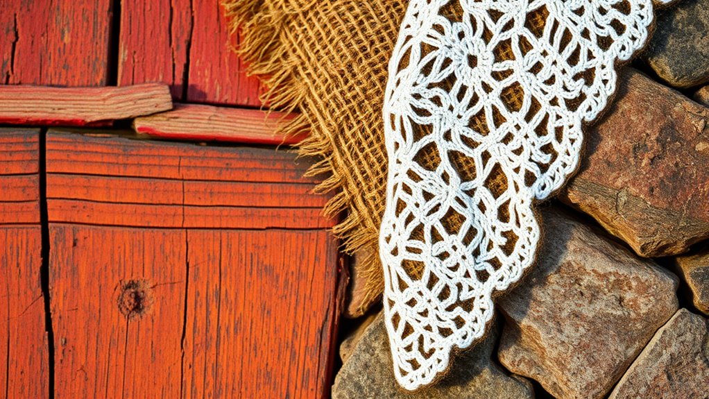 To choose contrasting textures without clashing, start by pairing smooth and rough elements intentionally. Think of combining sleek satin with tactile burlap or polished wood with rugged stone. Balance is key—use one dominant texture and accent it with a smaller dose of the contrasting one. Trust your eye, and don’t be afraid to experiment. When done thoughtfully, contrasting textures create visual interest while maintaining harmony and sophistication in your space.