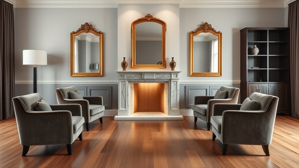 Symmetry enhances room acoustics by creating balanced sound reflections, making audio clearer and more pleasing. You’ll notice that evenly spaced surfaces and mirrored layouts direct sound waves evenly, reducing echo and dead spots. By thoughtfully aligning features, you foster a harmonious environment where sound flows smoothly, elevating both aesthetic appeal and auditory experience. This precise balance transforms your space into a sensory sanctuary, where music and speech resonate beautifully.