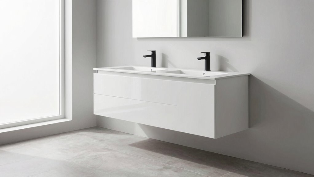 Floating vanities are generally more expensive than traditional ones, mainly due to installation complexity and design versatility. The cost comparison includes higher price tags for sleek, modern materials and custom mounting hardware. However, their versatile design can add value to your bathroom’s aesthetic, making them worth the investment. You’ll appreciate how they create a lighter, more open feel, which often balances out the slightly higher initial expense.