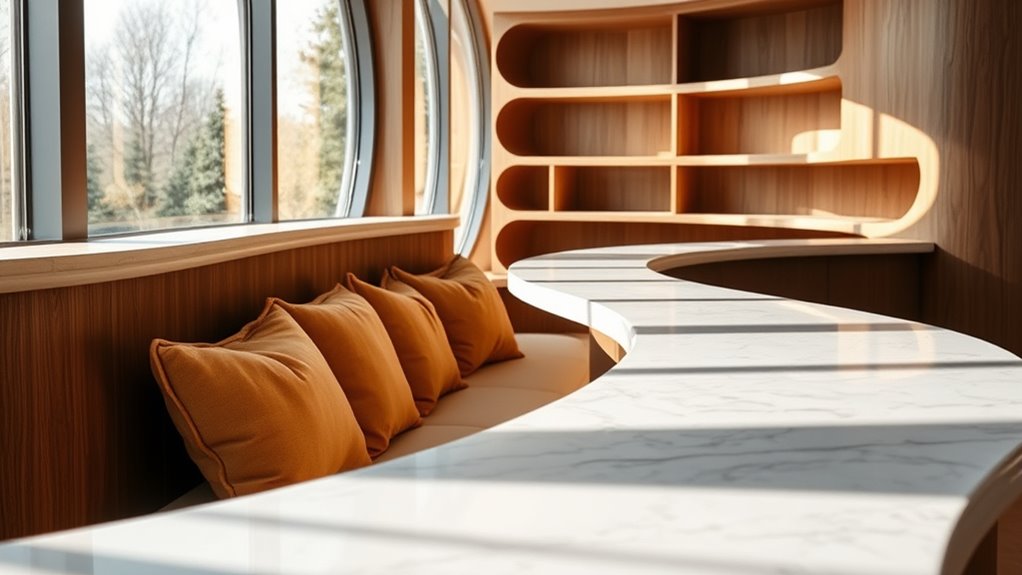 To enhance soft, curvy spaces, you’ll want to choose materials that invite touch and comfort. Plush upholstery adds warmth, while natural textures like wood or stone bring organic depth. Matte and soft finishes complete the look, creating a calm and inviting atmosphere. Incorporating health-conscious design principles can also promote well-being within these spaces.