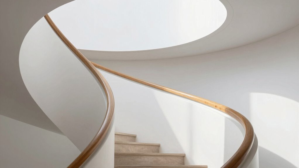 Soft, rounded shapes can do more than add aesthetic appeal—they also guide the eye and create a sense of harmony within a space. Use curves strategically to establish architectural fluidity, seamlessly connecting different areas and preventing harsh shifts. Curved lines draw attention and lead the eye naturally through a room, enhancing visual harmony. Balance is key: pair sweeping curves with straight lines to avoid chaos and maintain order. Incorporate curved architectural elements like archways or rounded corners to soften the overall design, creating a flowing, unified environment. When carefully integrated, curves foster a sense of movement and cohesion, making your space feel both dynamic and balanced. This thoughtful use of curves helps craft interiors that feel inviting, harmonious, and visually engaging. Understanding how smart design principles can enhance comfort and well-being will help you create more welcoming and functional spaces.