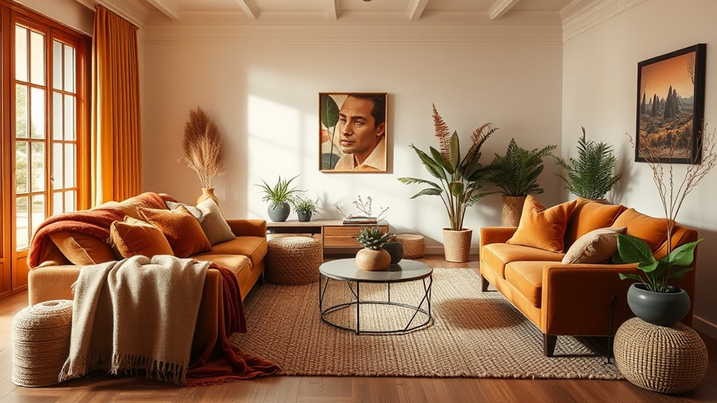 You can balance tailored decor with cozy fall elements by layering plush throws and textured pillows in neutral tones on sleek furniture. Incorporate warm wood accents and subtle metallic details to add sophistication without sacrificing comfort. Use tailored window treatments paired with rustic pumpkins or dried foliage. Mix clean lines with soft, inviting textures, creating a space that feels both polished and snug—perfect for fall’s shift vibe.