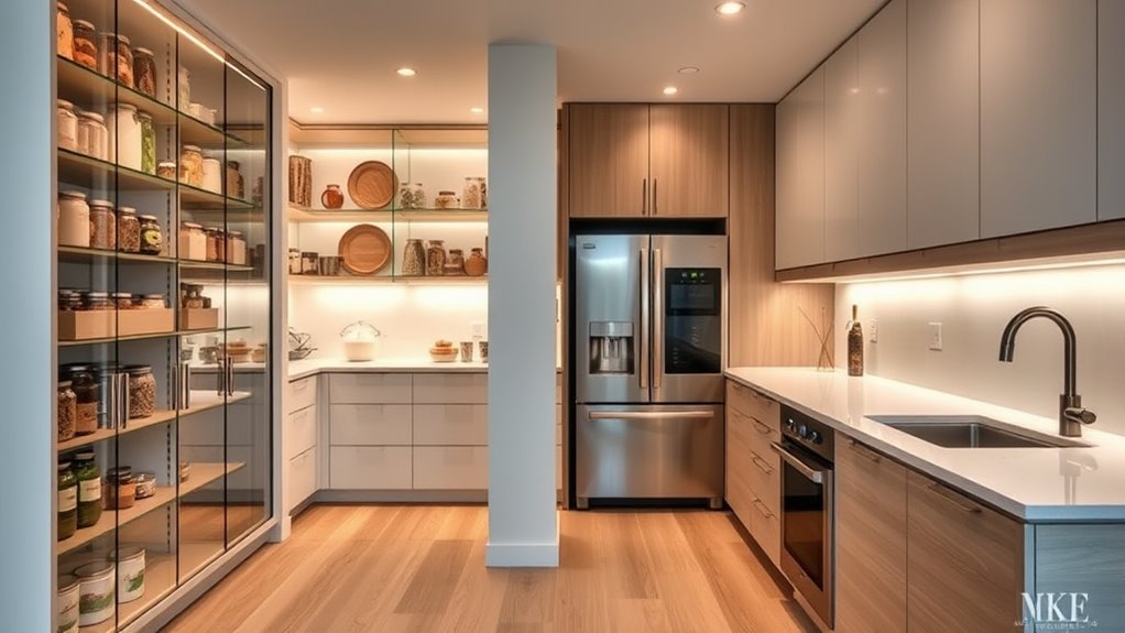 Secure your high-tech pantry with multi-layered measures: install biometric locks that respond to fingerprint or facial recognition, set up smart alarms that alert you to unauthorized access, and employ encrypted security systems that monitor activity around the clock. Combine these with surveillance cameras offering real-time footage, ensuring your culinary treasures stay protected. Think of it as a digital fortress—sleek, vigilant, and tailored to keep your pantry’s secrets safe.