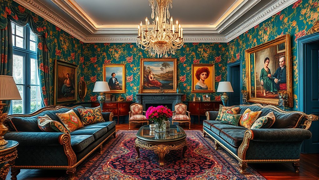 What exactly defines maximalism in decor? It’s about embracing boldness and layers, rather than sticking to a minimalist approach. Maximalism celebrates variety, mixing patterns, textures, and a rich array of decor pieces. Unlike subdued color schemes often found in minimalist styles, maximalist interiors thrive on vibrant hues and contrasting tones that create visual interest. It’s not about clutter but thoughtfully curated collections that reflect your personality and passions. You can combine vintage finds with modern elements, balancing excess with intentionality. The goal is to craft a space that feels lively and inviting, where every item tells a story. Maximalism invites you to express yourself freely, making your home uniquely vibrant and full of energy without sacrificing elegance. Incorporating eclectic decor is a key characteristic that helps achieve a sophisticated maximalist aesthetic.