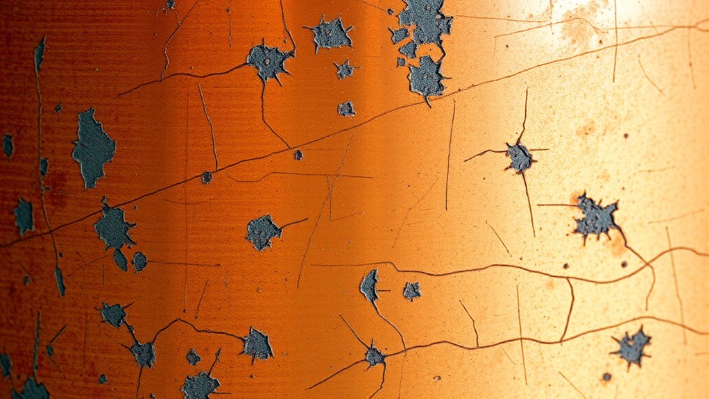 Over time, warm-toned metal finishes develop a rich, authentic patina that enhances their character. You’ll notice subtle color shifts, deepening hues, and gentle surface textures as they age. Light exposure, air, and handling accelerate this process, giving each piece a unique story. Instead of deterioration, these changes add warmth and charm, making your metal finish look more vintage and refined, perfectly reflecting its history and adding a timeless appeal.