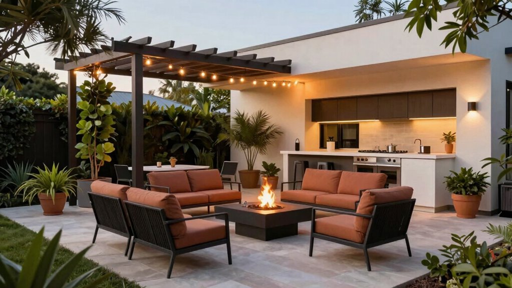 Today, homeowners want outdoor spaces that reflect their personality with personalized touches like custom plants, outdoor art, and unique lighting. Comfort and style matter, so they incorporate smart technology, quality sound systems, and eco-friendly materials. Creating distinct zones for relaxation and dining enhances functionality. Sustainable practices, water conservation, and future trends like smart features also shape these spaces. If you explore further, you’ll uncover how you can craft an outdoor retreat that’s both stylish and sustainable.