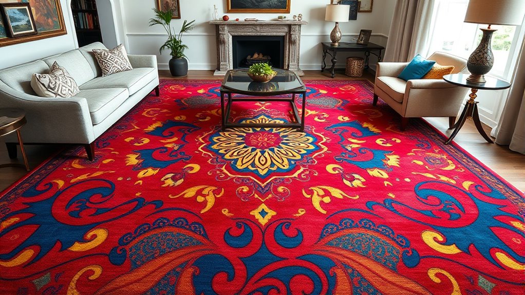 In recent years, statement rugs have become a bold centerpiece in interior design, transforming plain spaces into visually striking environments. Your choice of area rug placement plays a vital role in highlighting its pattern and colors, making the room feel more cohesive and lively. When selecting a statement rug, consider the flooring material durability; you want a rug that can withstand daily wear without losing its vibrant appeal. Durable flooring materials like hardwood, tile, or concrete provide a sturdy base that complements the rug’s bold patterns. Proper placement ensures the rug becomes a focal point rather than an afterthought. Additionally, choosing statement rugs made from high-quality materials can enhance their longevity and visual impact. As a result, your space gains personality and depth, showcasing your unique style while maintaining practicality. Statement rugs truly revolutionize interior design by blending aesthetics with functionality.