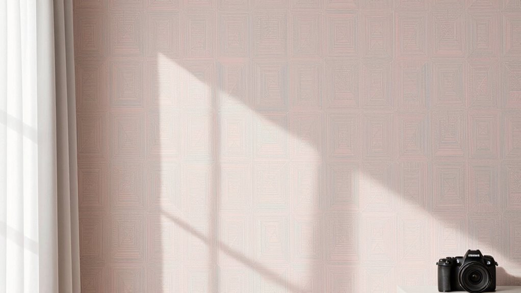 Playing with neutral tones allows you to highlight the understated pattern design without overwhelming the space. This approach guarantees your modern aesthetic remains sleek, balanced, and effortlessly stylish.