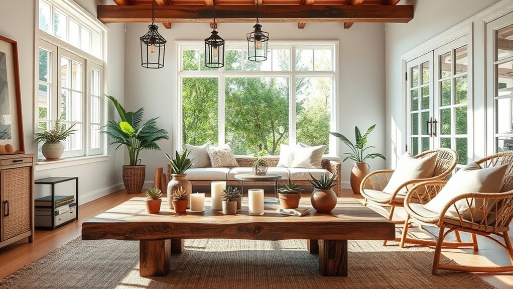 To achieve sustainable decor with low-impact looks, choose furniture made from reclaimed or FSC-certified sustainable materials, and opt for natural fibers like jute, hemp, or organic cotton for accessories. Incorporate energy-efficient LED lighting and maximize natural sunlight to cut down energy use. Add greenery with native plants in eco-friendly pots to improve air quality. Supporting local artisans and vintage pieces also reduces waste and transportation emissions. Keep exploring for more ideas to make your space eco-conscious and stylish.