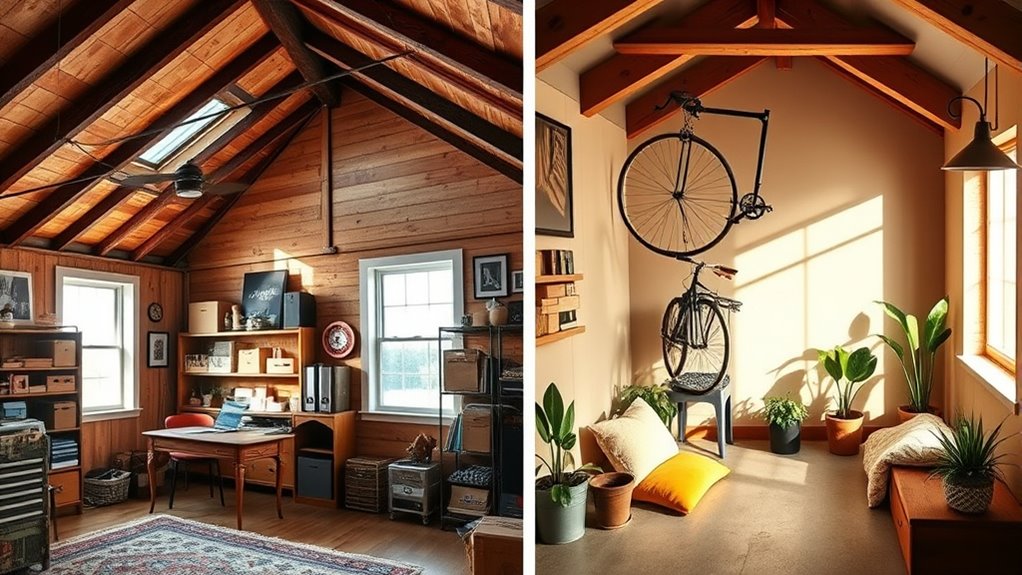 Transforming unused spaces like attics, garages, and lofts open the hidden potential within your home. Picture turning an attic into a cozy retreat or an art studio, a garage into a stylish workshop, or a loft into an inviting bedroom or reading nook. With thoughtful design—adding insulation, lighting, and storage—you can create personalized, functional areas that reflect your style. Keep exploring how to turn neglected corners into vibrant, valuable spaces that truly feel like home.