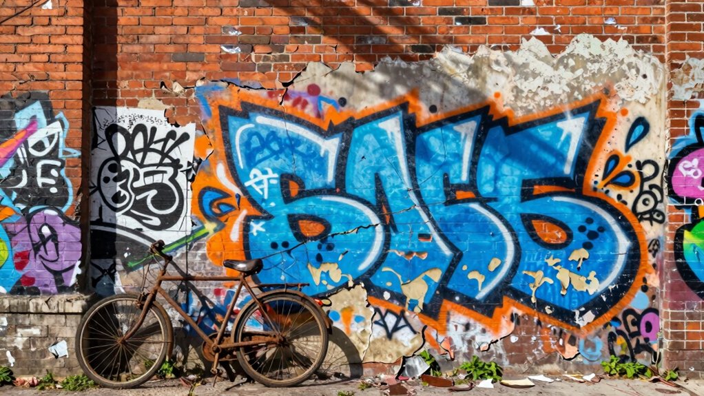 To truly capture the character of a wall, focus on its texture and the atmosphere it creates. Notice how graffiti art adds layers of color and emotion, transforming plain surfaces into storytelling canvases. Pay attention to surface patterns—cracks, peeling paint, and weathered textures—that reveal a wall’s history and age. Use side lighting or shadows to emphasize these details, creating depth and mood. Close-ups can highlight rough textures, while wider shots showcase the overall atmosphere. Your goal is to convey the wall’s story through its visual texture and the vibe it exudes. By focusing on these elements, you’ll produce compelling images that reveal the soul behind each surface, capturing a moment before change transforms the space forever.