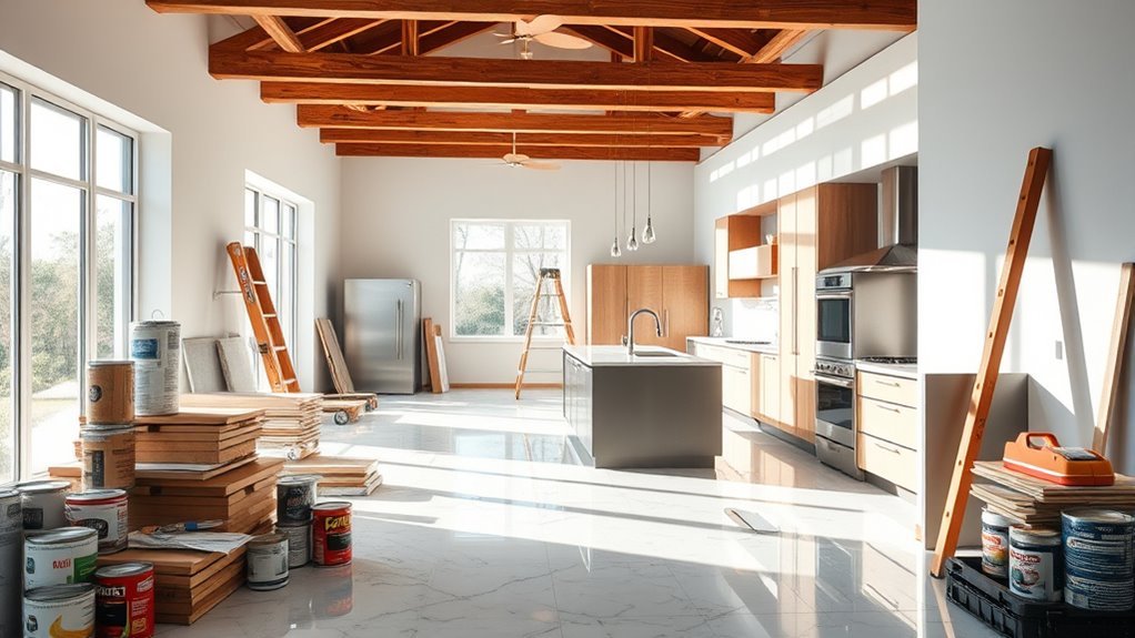 If your project falls behind, act quickly by consulting your contractor to identify the cause and adjust the schedule accordingly. Prioritize tasks, allocate additional resources if needed, and communicate transparently with all stakeholders. Consider extending work hours or weekends to catch up. Regularly monitor progress to prevent further delays, and stay flexible to accommodate unforeseen issues. Staying proactive guarantees minimal disruption and keeps your remodel on track.