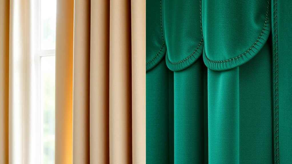 When revitalizing your drapes, choosing between ready-made options and custom hemming depends on your style and needs. Ready-made curtains are perfect for quick updates, but they may need hemming for a polished look. Custom hemming offers precision, elevating fabrics like silk or velvet with clean lines and tailored folds. For a sleek, high-end vibe or unique window shapes, custom finishing elevates your space—discover how subtle details can transform your decor’s personality.