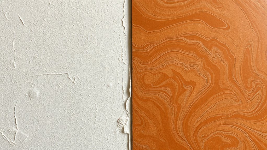 Think of surfaces as blank canvases waiting for a painter’s touch; both limewash and Venetian plaster can adapt, but not all surfaces are ready for their embrace. You’ll find that porous walls, like old brick or plaster, enthusiastically accept limewash’s whisper, while smooth, sturdy surfaces like drywall better suit Venetian plaster’s luxurious layers. Prepare your surface carefully, ensuring it’s clean and appropriate, so your chosen finish can truly shine.