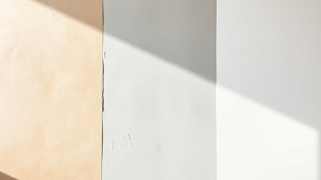 The aesthetic appeal and texture of wall finishes considerably influence the mood and style of a space. Venetian plaster offers remarkable texture depth, creating a rich, tactile surface that exudes luxury. Limewash, on the other hand, provides a softer, matte appearance with subtle visual contrast, giving walls a natural, aged look. Paint generally offers a smooth, even finish, but can vary with techniques like faux finishes or textured brushes to add visual interest. The choice between these finishes depends on the atmosphere you want to create; Venetian plaster adds drama, limewash lends a rustic charm, and paint offers versatility. By considering texture depth and visual contrast, you can select a wall finish that perfectly complements your design vision. Additionally, understanding home improvement principles can help you make more informed choices that enhance both aesthetics and functionality.