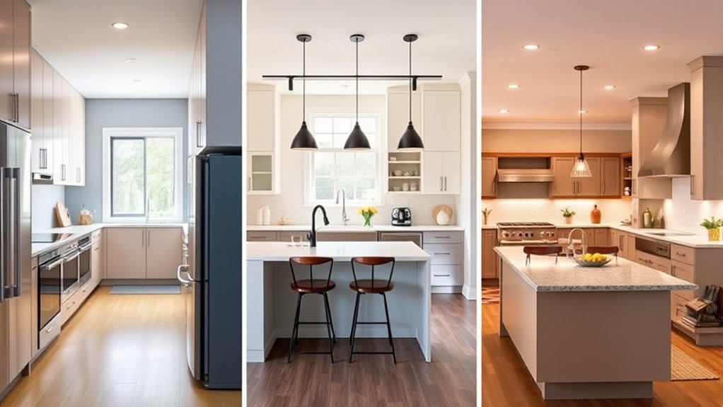 Did you know that around 60% of home cooks prefer U-shaped kitchens for their versatility? To choose the right layout, consider your cooking style: if you love prepping with multiple appliances, a U-shape offers ample counter space. For quick meals, a galley keeps everything within reach. If you entertain often, an L-shape creates a social hub. Match your workflow to your habits for a kitchen that truly works for you.