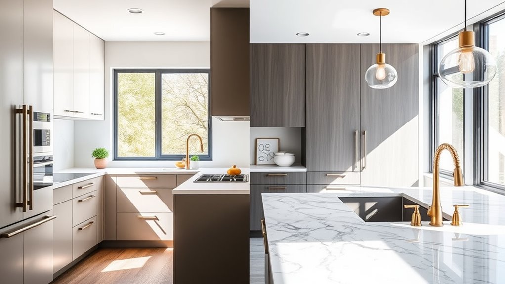 After selecting durable materials for your home’s exterior and floors, turning your attention to kitchen and bathroom finishes can considerably elevate both functionality and style. Investing in luxury fixtures, like high-end faucets and sleek sinks, creates a polished look while enhancing usability. Incorporate designer accents such as statement backsplashes, custom cabinetry, or elegant countertops to add personality and sophistication. These details can transform your spaces from basic to luxurious without overspending. Focus on quality over quantity—well-chosen finishes make a significant impact. Prioritizing these finishes ensures your kitchen and bathrooms look stunning and function efficiently for years to come. Additionally, selecting innovative interior design ideas can further personalize your spaces and reflect your unique style.