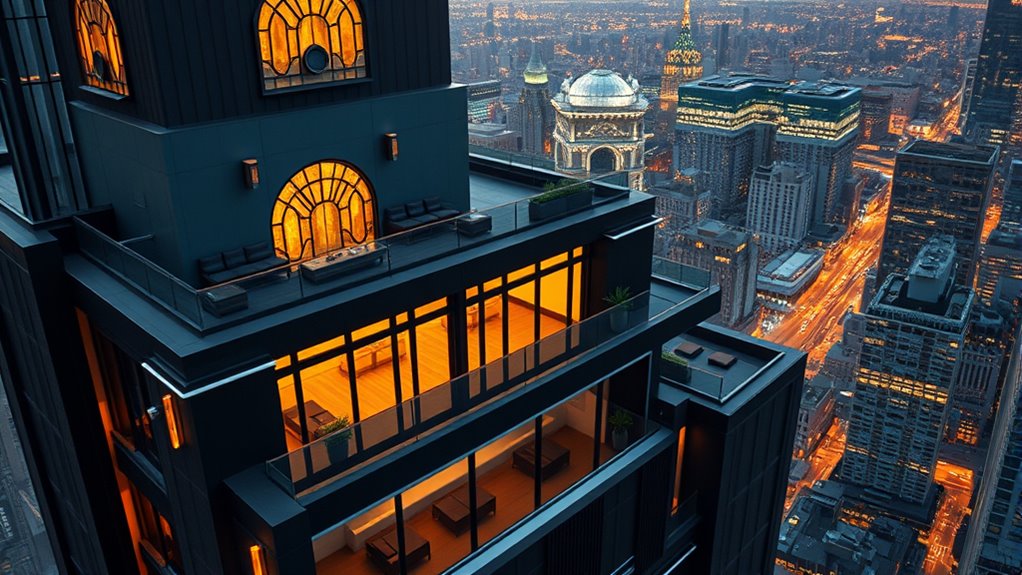 Discover a stunning Art Deco penthouse that combines 1920s glamour with modern city living. You’ll see how it features vintage-inspired geometric motifs, bold color palettes, and luxurious materials like marble and gilt accents. Open spaces, soaring ceilings, and panoramic city views create an elegant atmosphere. Vintage touches blend seamlessly with smart technology and modern comforts, resulting in a timeless yet contemporary space. Continue exploring to uncover every detail of this breathtaking design journey.