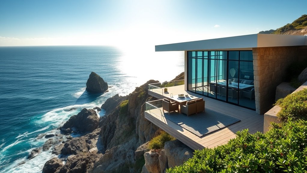 Discover how this cliffside oceanfront home redefines coastal luxury with its innovative design inspired by natural surroundings. You’ll see sustainable methods like solar panels, rainwater harvesting, and eco-friendly materials like recycled steel and local wood. Experience interiors that blend stunning views with natural decor and artistic murals. The landscape seamlessly connects indoors and outdoors with native plants and serene outdoor spaces. Keep exploring to learn how visionary architects balance beauty, sustainability, and functionality effortlessly.