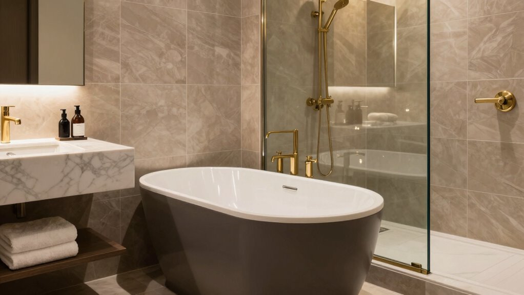 Choosing fixtures and materials that add opulence starts with prioritizing quality and craftsmanship. Invest in luxury fixtures like sleek faucets, elegant showerheads, and refined handles that elevate your bathroom’s aesthetic. Opt for opulent materials such as marble countertops, rich wood accents, or high-end tiles to create a lavish atmosphere. Look for finishes like gold, brass, or matte black to add a touch of sophistication. Balance these luxurious elements with practicality to guarantee durability and ease of maintenance. Remember, the right combination of luxury fixtures and opulent materials transforms a functional space into a luxurious retreat. Focus on details and craftsmanship to ensure each element contributes to the overall sense of elegance and refinement.