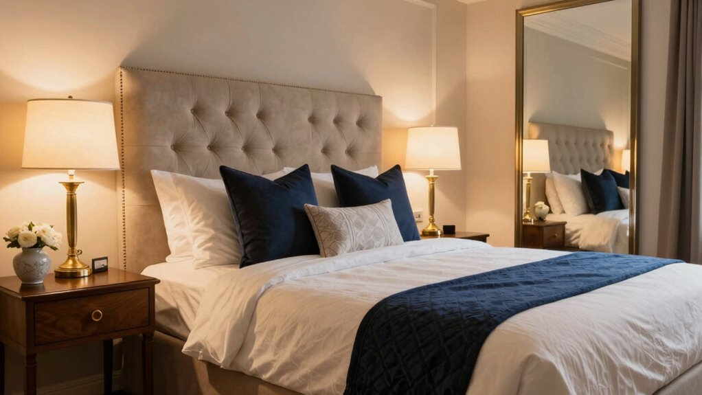 You might think upgrading your guest room costs a lot, but you can achieve a boutique hotel vibe affordably. Start with luxury bedding to add instant elegance and invest in ambient lighting to create a cozy, inviting atmosphere. Repainting walls in a sophisticated color, adding stylish accessories, and decluttering also help elevate the space without breaking the bank. These simple changes make your guest room feel special and luxurious.