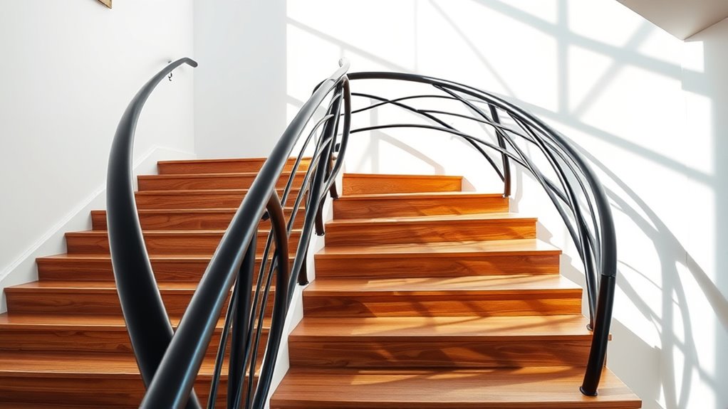 You’ll notice how the sculptural stair railings transform a functional element into a stunning piece of art, showcasing meticulous craftsmanship. Every curve and surface is carefully crafted to balance boldness with elegance, resembling flowing sculptures inspired by nature. The materials, likely steel or bronze, are polished to highlight their beauty and durability. Shadows and light play deeply on each contour, emphasizing movement and dimensionality. Explore further to discover how these artistic railings redefine architectural expression and craftsmanship mastery.