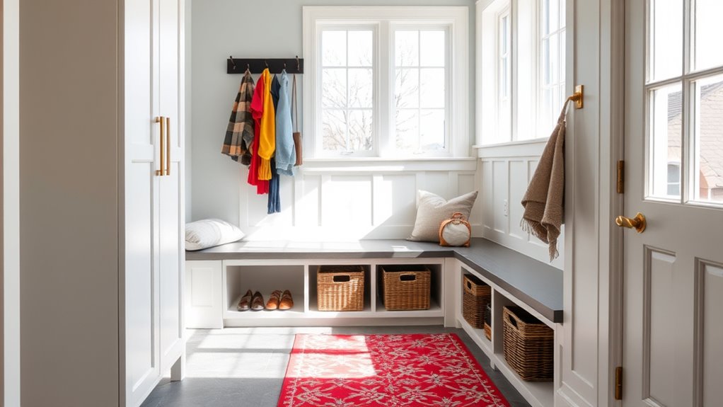 Did you know that personalized storage boosts family efficiency by 30%? To customize your mudroom, consider adding adjustable shelving that adapts to your family’s changing needs. Incorporate hooks at different heights for kids and adults, and choose stylish bins that complement your decor. Use a color scheme that reflects your family’s personality, and include designated zones for shoes, backpacks, and outdoor gear—making the space both functional and uniquely yours.