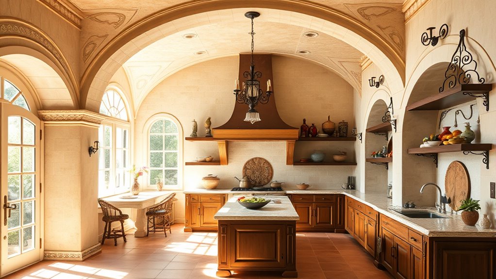 In this Mediterranean Revival kitchen, expertly crafted arches feature complex curvature supported by reinforced steel and keystones that evenly distribute weight. Textured plaster finishes, applied in multiple layers with hand tools, mimic aged, sun-baked walls, enhancing authenticity and depth. Precise joint detailing ensures seamless shiftings and crack prevention, while textured surfaces improve durability. Technical execution reflects traditional techniques adapted for modern construction, creating an environment where craftsmanship meets structural integrity—discover how these details contribute to the overall aesthetic and resilience.