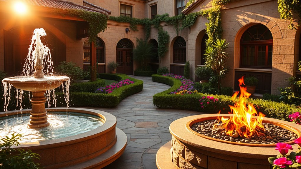 In designing your courtyard, you combine water features like fountains to create calming sounds and attract wildlife, fire elements such as fire pits or fireplaces for warmth and coziness, and layered planting with shrubs, flowers, and herbs for visual interest and sensory appeal. These elements work together to craft a tranquil, functional space that balances beauty with comfort. Exploring more details will reveal how each feature enhances your outdoor oasis and complements your lifestyle.