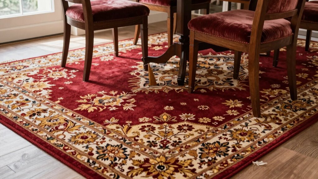 Choosing the right rug size is key to creating a balanced look, so avoid one that’s too small or too large for your table. Proper placement matters too—make sure your rug extends enough to fit all your chairs when pulled out. Ultimately, coordinate your rug with your furniture’s style and color to achieve a cohesive and inviting dining space.