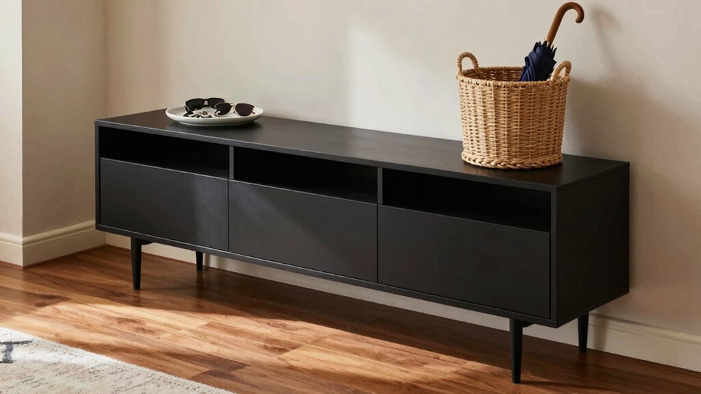 You can choose eco-friendly storage options for your foyer by selecting pieces made from sustainable materials like bamboo, reclaimed wood, or recycled plastic. These options help reduce environmental impact while keeping your space organized. Look for furniture that uses non-toxic finishes and minimal packaging. Incorporating sustainable storage not only supports eco-conscious living but also adds natural warmth and style to your foyer, making it both practical and environmentally friendly.