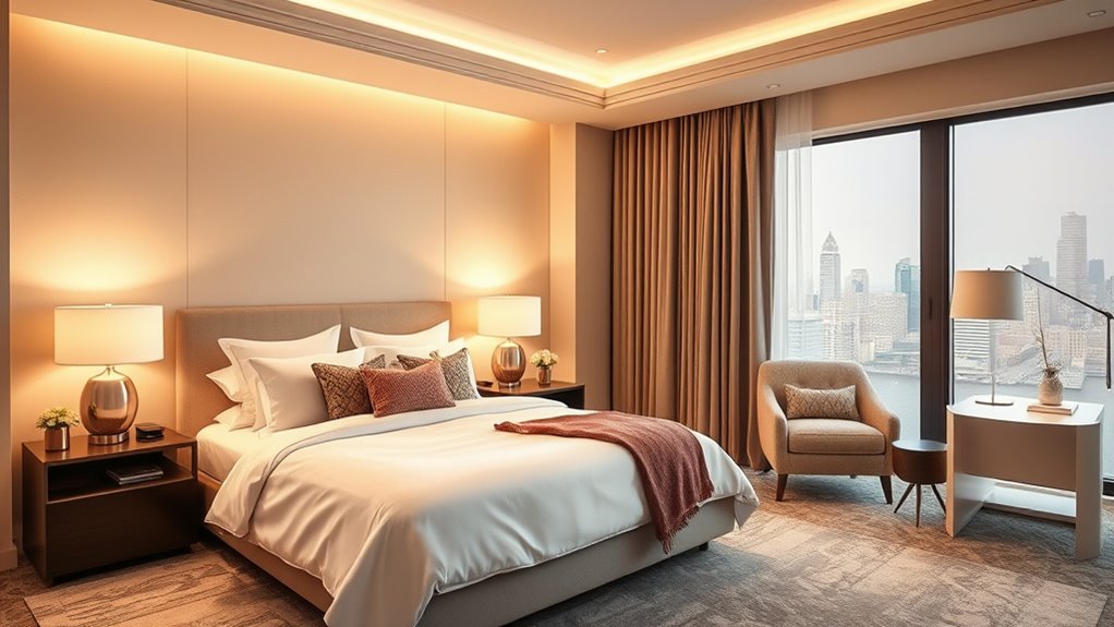 Did you know good lighting can boost guest satisfaction by 70%? To create cozy, inviting spaces, opt for layered lighting—use warm LED sconces or bedside lamps for ambient glow, complemented by adjustable task lighting for reading. Dimmable fixtures let your guests set the mood, while soft, warm tones make the room feel welcoming. Prioritize natural light during the day and add blackout curtains for restful sleep at night.