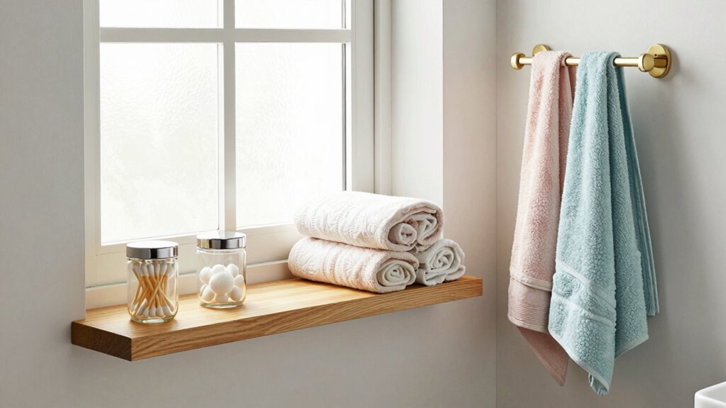Over the door hooks are a simple yet effective way to free up valuable bathroom space. They’re perfect for lazy organizing, keeping everyday items easily accessible without cluttering your counters. By installing hooks over the door, you create a designated spot for towels, robes, or accessories, saving drawer and cabinet space. Choose stylish solutions like sleek metal or decorative wooden hooks to add a touch of personality to your bathroom. To maximize their effectiveness, group similar items together, such as all towels or hair accessories. This not only keeps your space tidy but also makes it easier to find what you need quickly. Over the door hooks are a versatile, budget-friendly way to transform underused space into a functional storage solution.