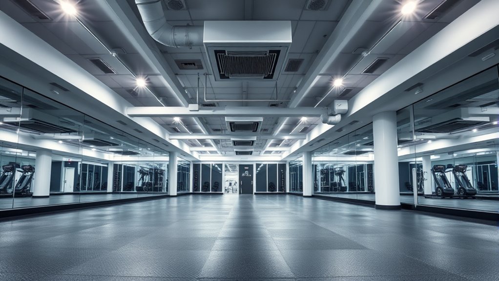To optimize your gym environment, select durable flooring like rubber for weightlifting areas to reduce damage and joint stress, while foam tiles work well for cardio zones to minimize fatigue. Strategically position large mirrors at eye level to promote safety and motivation, ensuring secure mounting and glare-resistant finishes. Implement an efficient airflow system with properly sized HVAC units, exhaust fans, and well-placed vents to maintain air quality and comfort. Continuing further will reveal detailed strategies for integrating these critical components seamlessly.