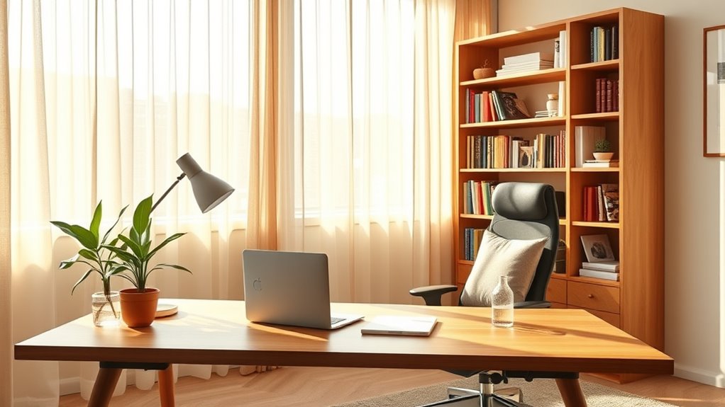 Your home office is your sanctuary, blending sleek aesthetics with ergonomic comfort to spark focus. Imagine sunlight filtering softly through curated decor that energizes yet calms, while a spacious desk and supportive chair keep you grounded. Flexibility comes through adaptable zones, mobile setups, and creative touches that inspire movement and ideas. This harmonious balance nurtures productivity and well-being, making every moment at work both efficient and enjoyable—stay with us to discover how to craft your perfect workspace.