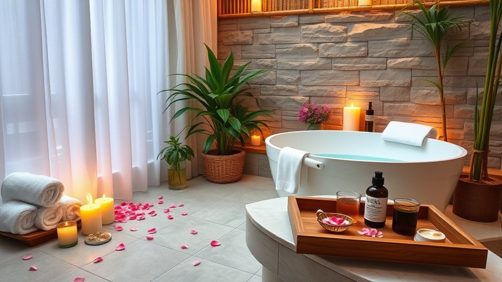 To create your home spa retreat, start by organizing a dedicated, clutter-free space with cozy seating and natural elements like plants. Choose calming essential oils and soft lighting to set a relaxing mood. Invest in quality skincare and massage tools, and incorporate mindfulness practices such as meditation and breathing exercises. Regularly update your decor and ambiance to keep your sanctuary fresh and personalized. If you explore these tips further, you’ll discover how to turn your space into a true haven of relaxation.