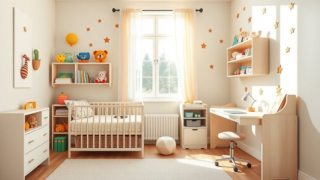 Imagine you’re a modern-day explorer, and safety is your compass. In grow-with-me rooms, you’ll want to install outlet covers, secure furniture to walls, and use cordless window coverings. Keep small objects out of reach and choose non-toxic, durable materials that grow with your child. Regularly check for hazards and guarantee sharp edges are softened. These steps create a safe, adaptable space where your child can thrive and explore confidently.
