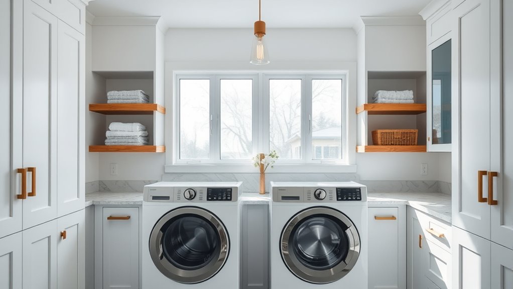 Imagine your small laundry room transforming into a clever oasis of efficiency. You can maximize space by installing compact shelving that stacks your essentials vertically, freeing up precious floor area. Consider fold-down stations that tuck away when not in use, creating a seamless, clutter-free environment. These space-saving ideas make your laundry routine smoother, turning a tight spot into a functional, stylish space you’ll enjoy every day.