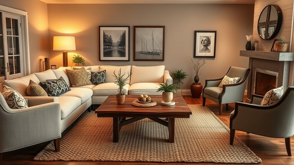 To create inviting conversation zones in your living room, arrange your furniture thoughtfully—faces-to-face sofas and chairs, cozy sectionals, or semi-circles encouraging eye contact and connection. Layer warm lighting and add textured throws, rugs, and ambient music to deepen the atmosphere. Incorporate personal touches like artwork and meaningful objects to make your space authentic and welcoming. Small details truly set the mood, so explore how these elements work together to craft your perfect social hub.