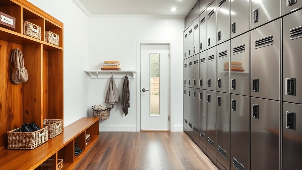 Think of lockers as Fort Knox for your belongings. They often feature lock options like key locks, combination locks, or digital keypads, giving you control over access. Some models include built-in alarms or tamper-resistant hardware for added security. You can also opt for lockers with reinforced doors and sturdy locks, ensuring valuables stay safe. With these features, you’re well-equipped to protect personal items in your mudroom.
