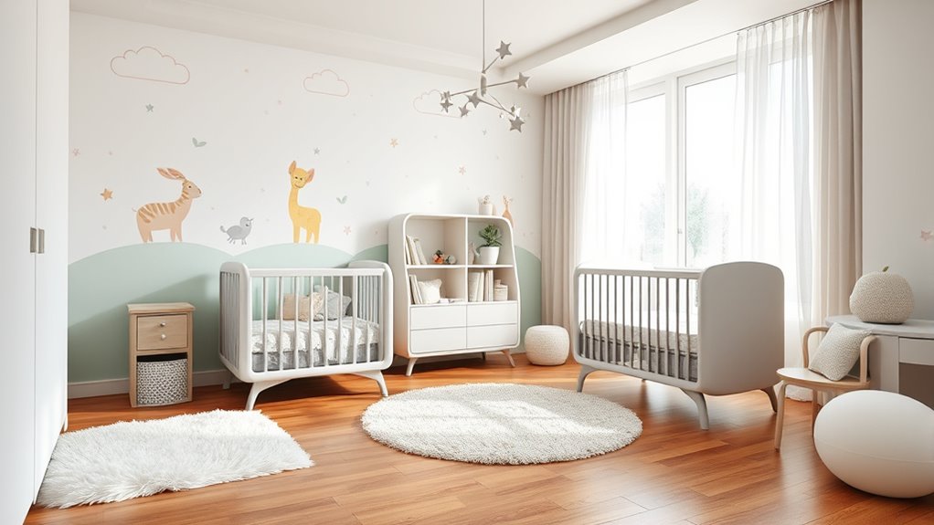 You can effectively soundproof your nursery by adding thick, plush rugs to absorb noise and installing heavy curtains or drapes over windows. Consider using acoustic panels or foam tiles on walls to reduce sound transmission. Sealing gaps around doors and windows with weatherstripping also helps. Keep furniture away from shared walls to minimize noise transfer. Always choose non-toxic, eco-friendly materials to maintain a safe environment for your little one.