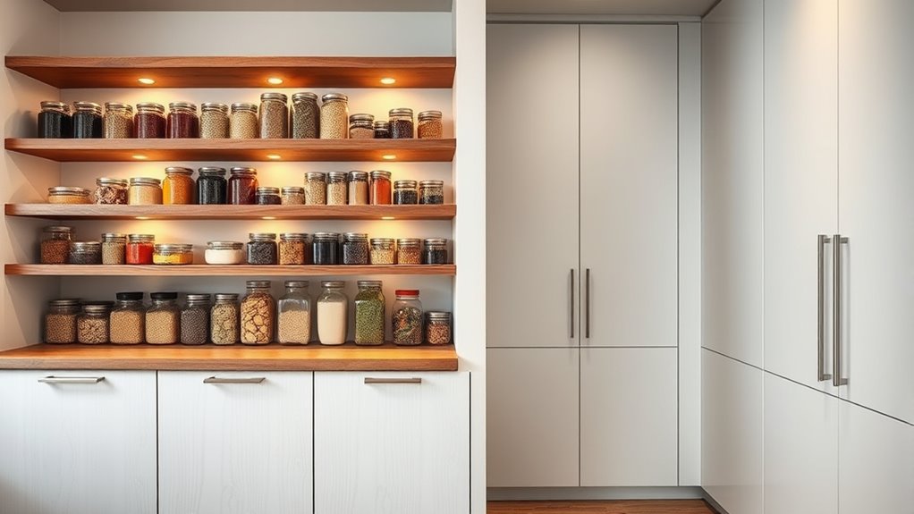 Ultimately, choosing between open shelves and closed storage boils down to your personal style and organizational needs. Open shelves transform your pantry into a visual feast, turning everyday essentials into artful displays, while closed cabinets offer a sanctuary of clutter-free serenity. Whichever you select, remember that your pantry’s design shapes your daily rhythm—making it feel like a well-orchestrated symphony rather than chaos. With thoughtful curation, your pantry becomes a sanctuary as harmonious as a masterpiece.