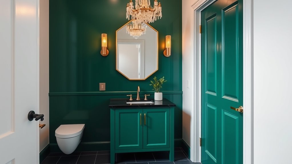 Have you ever considered how a striking lighting fixture can elevate your powder room’s style? Statement lighting is your best friend when creating a bold, jewel-inspired look. Opt for fixtures that mimic the sparkle and richness of gemstones, like chandelier-style lights or pendant fixtures with crystal embellishments. These jewel-inspired fixtures add a luxurious touch and serve as eye-catching focal points. Position your statement lighting to cast warm, inviting light that highlights your bold wall colors or wallpaper. Don’t shy away from metallic finishes—gold, silver, or chrome—to enhance the jewel-like effect. Remember, the right lighting not only illuminates but also accentuates your design choices, transforming a small space into a glamorous, jewel box-worthy retreat. Incorporating statement lighting fixtures can also enhance the overall ambiance and make your small bathroom feel more expansive and opulent.