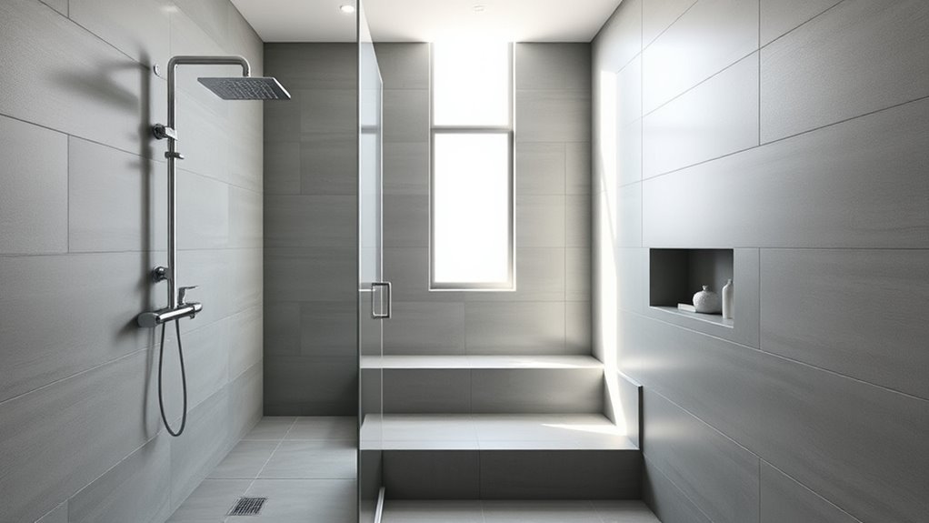 When planning a primary bath wet room, focus on seamless waterproofing that extends beyond the shower zone to prevent leaks and damage. Guarantee your floor slopes gently toward drains like linear or point options for efficient water removal. Opt for durable, moisture-resistant fixtures, and use large-format tiles for a sleek, low-maintenance finish. Proper ventilation and layered lighting improve air quality and ambiance. Mastering these technical elements creates a safe, stylish space—exploring further reveals even more design possibilities.
